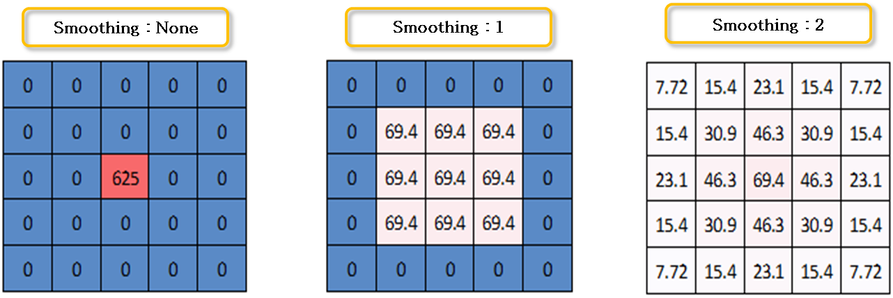 Smoothing 2 선택 시 7.72는 Smoothing 1 에서 계산된 69.4를 인접하는 9개의 픽셀로 나눈 값을 가지며, 15.4는 7.72 Data 값이 2번 누적된 값이며, 23.1 은 7.72값이 3번 누적된 값을 나타냅니다.