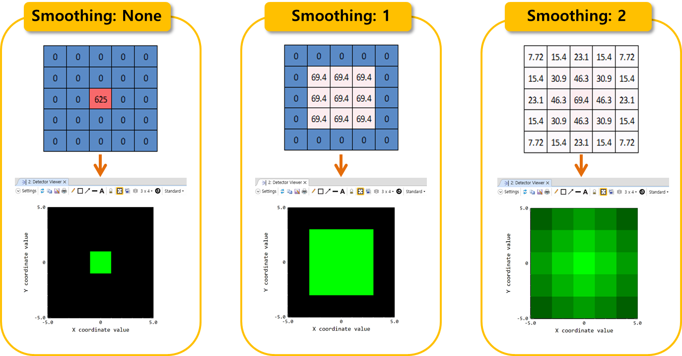 Zemax의 NSC Detector Viewer에서 Smoothing은 다음과 같은 방식으로 작동합니다.
