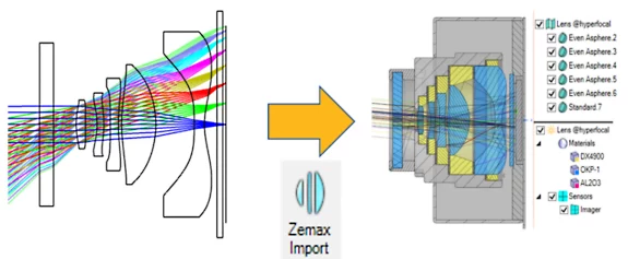 그림 2. Zemax Import는 OpticStudio의 렌즈 시스템 설계(왼쪽)와 Speos의 각 렌즈의 파라미터화된 기본 뷰(오른쪽) 간의 데이터 전송을 자동화합니다.